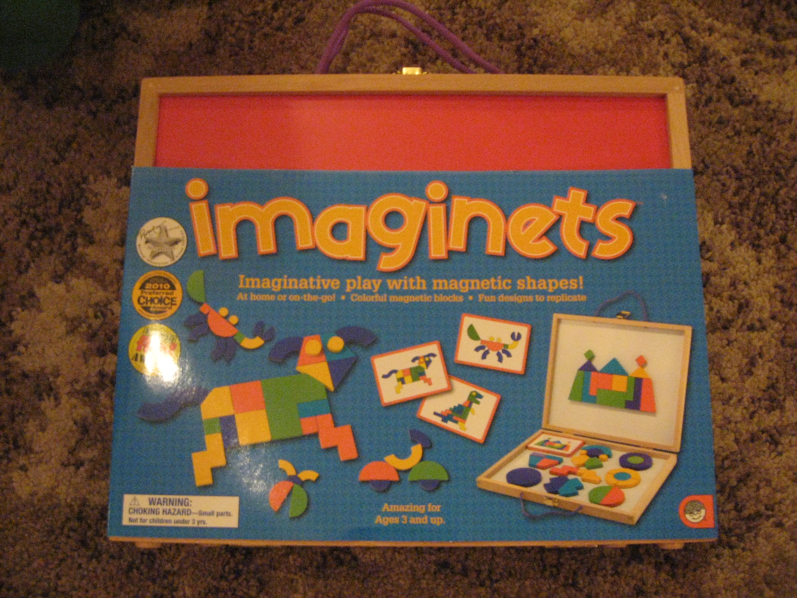 Imaginets are brightly colored, geometric shaped, wooden magnets. They come in a wooden case that is great for storage and transportation. Kids can follow the design cards to build an object or build using their imagination. On the inside of the case, are dry