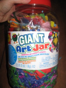 My girls (2.5 and almost 5) love arts & crafts projects. No matter how many supplies I stock up on, we never seem to have enough. This jar has a little bit of everything. Today we are going to use our Giant Art Jar supplies to decorate glass votive holders to give as Christmas gifts. I think I am as excited as the girls are!