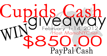 Wow, who couldn’t use an extra 850.00? I sure could! Lots of bloggers have came together to provide you with this awesome cash giveaway that ends on valentines day. This event is hosted by mamawithA, mamanyc, Tethered mommy, eco crazy mom and in random. Seems how there are lots of bloggers participating, you might see this same giveaway on other blogs that you follow. Be sure to only enter on one blog, seems how there is only one winner we are all using the same entry form. Good luck to everybody!