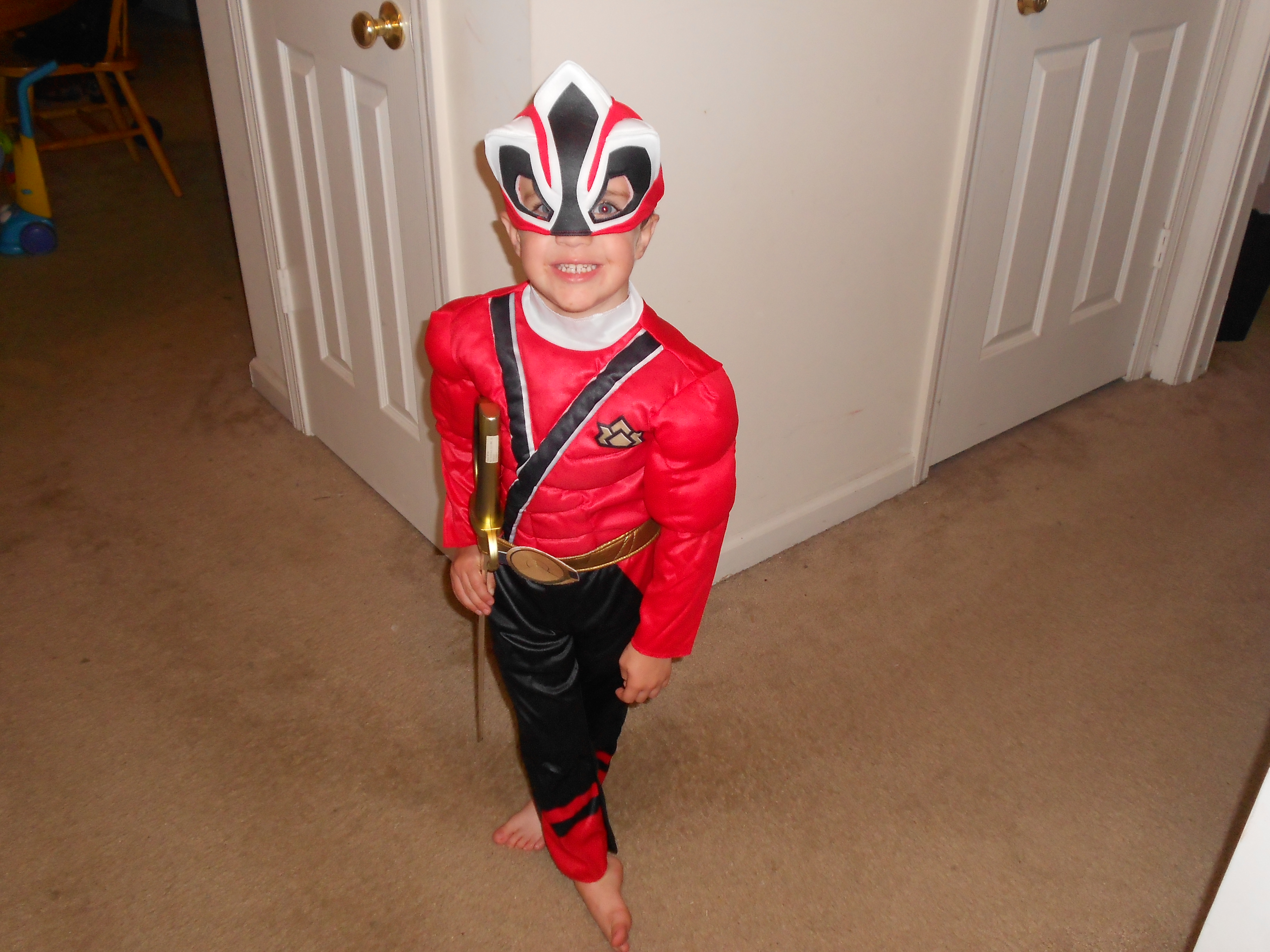 Buycostumes.com allowed me to pick out a costume and it took Little C to pick just one out. I think we literally took close to an hour. There are so many choices, even in toddler sizes. We went from superman to spiderman to Jake and The Neverland Pirates before Little C finally picked out the Power Rangers Red Samurai Ranger. I believe we checked out mail around 8 the night that we got it. I tried to talk Little C into waiting until the next day to try it on, however,