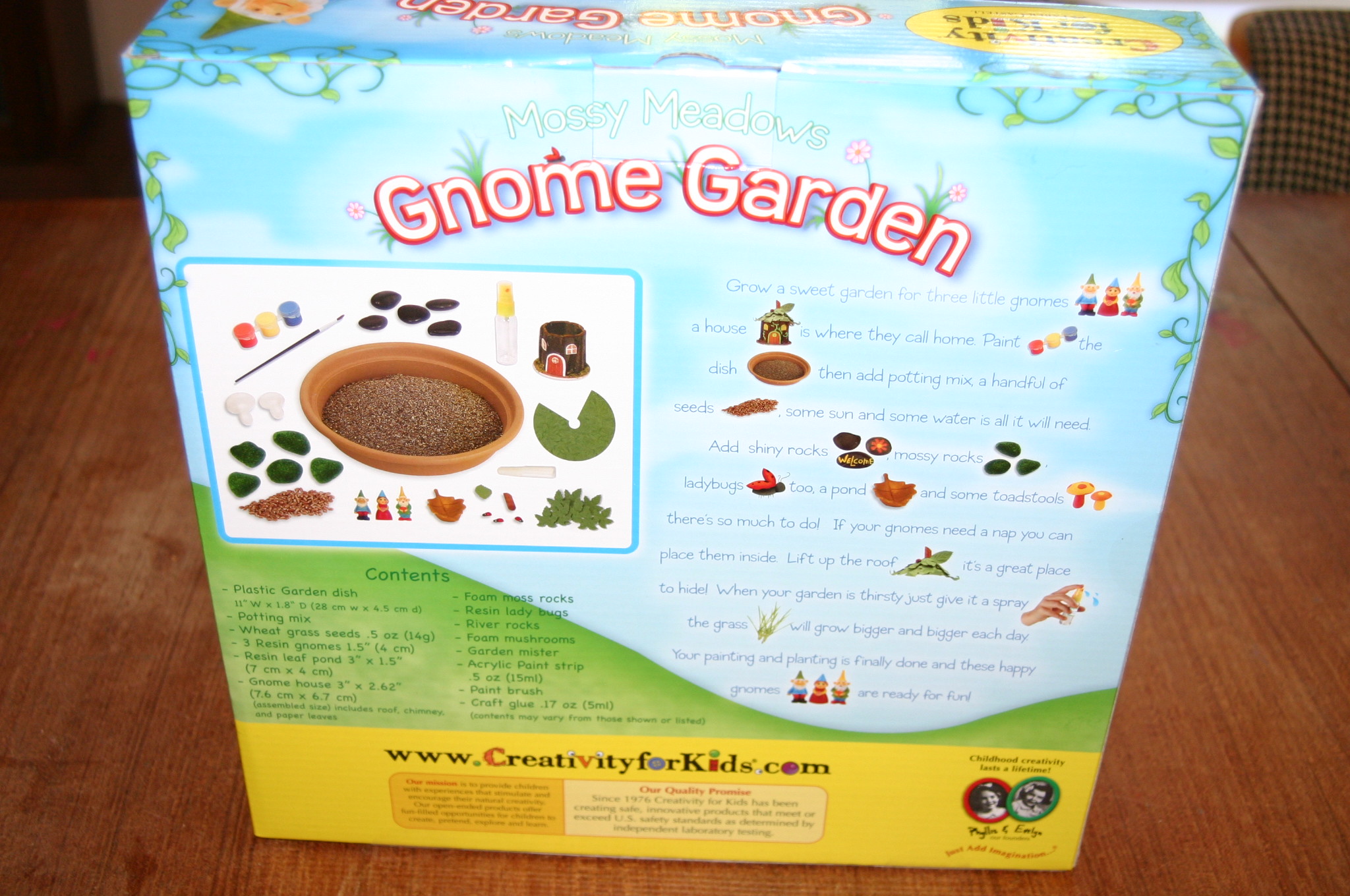 Mossy Meadows Gnome Garden kit includes a garden dish, soil, grass seeds, gnome house, garden pond, rocks, stones, toadstools, ladybugs, gnome family, paint brush, paint, and garden mister; all the tools needed to customize your little enchanted forest.