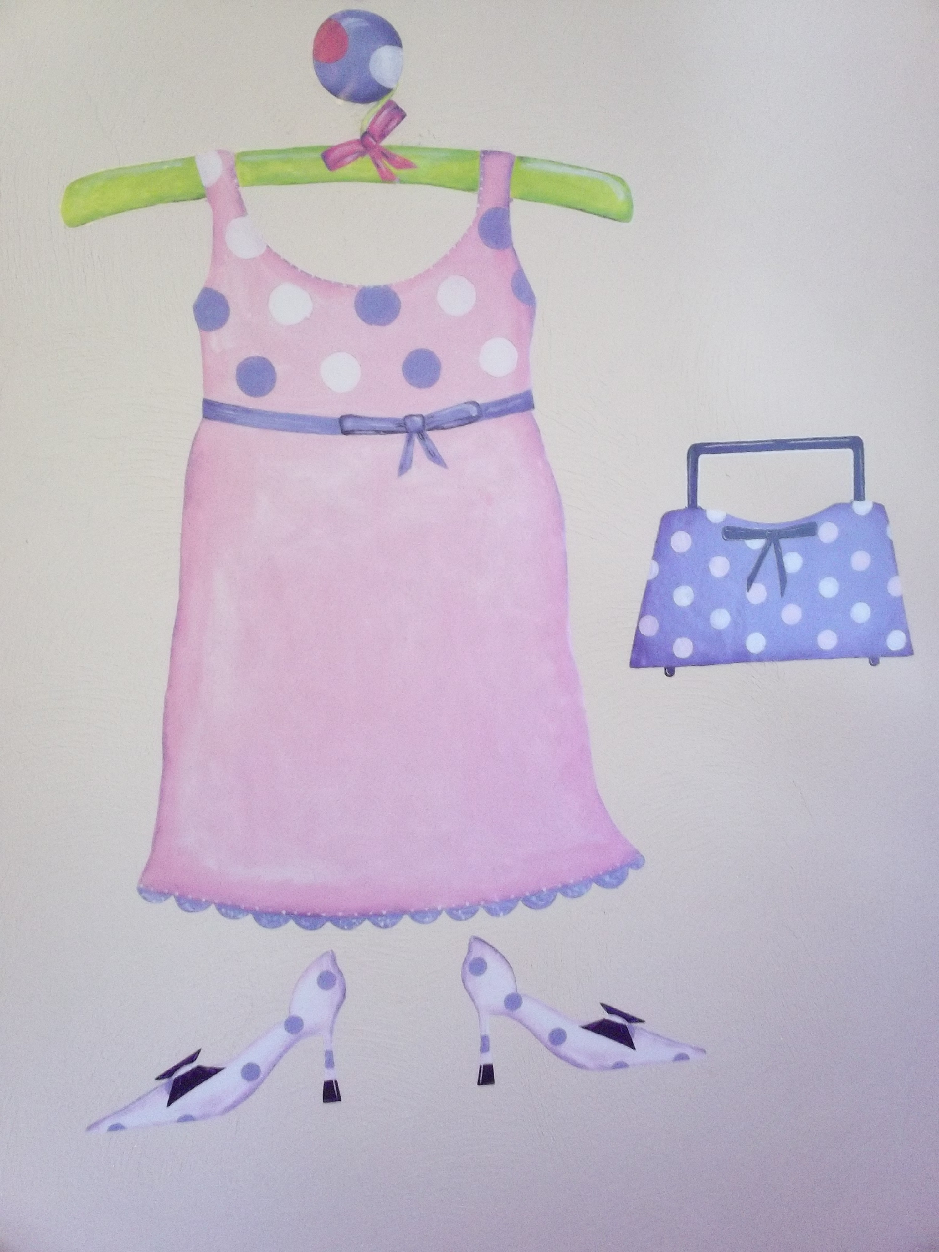 My little girls (ages 5 and 3) enjoyed helping me apply these wall decals. They share a room so we divided the MegaPack in half and they both decorated the wall next to their bed. They chose two dresses, two pairs of shoes, and two purses. While I applied the Dress Up decals, I let the girls apply the accent dots.