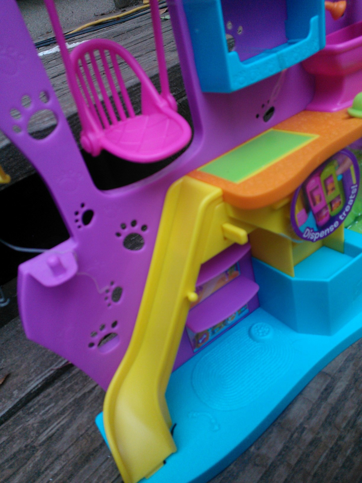 I was impressed with this set because instead of including one or two animals and forcing you to buy more if yo want more, the set comes with 8 pets as well as a polly. I also enjoyed the fun features such as a slide, swing and elevator that I knew would excite my little sister. When I first let her play with it she mentioned that “The slide is awesome, I don’t have any slides in my other sets!” I was surprised when I noticed that she could drop pets from near the top of the slide down into a shoot below. I hadn’t noticed that there was a flap that can be controlled with a small lever that lets things drop through. I also was surprised to discover that the canisters that hold dog trees are actually functional as well. There is a lever on the side that lets the treats drop down. Jorden discovered these on her own while playing, but I could have read the box to find this information as well. I had just focused on opening and photographing everything before she got to see the set because I knew she’d want to play and I wanted time to take photos uninterrupted, but the box explains the features as well.