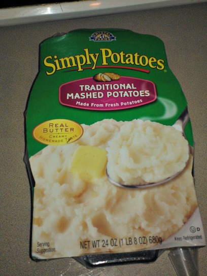 Simply Potatoes is a brand that makes potato products including mashed potatoes, hash browns, diced potatoes, etc that are found in the refrigerated section of the grocery store. I’ll be honest – I had never purchased refrigerated mashed potatoes before so I was curious to see what the texture and flavor would be like. My store carried two varieties – traditional mashed potatoes and garlic mash potatoes so I picked up a couple of each type.