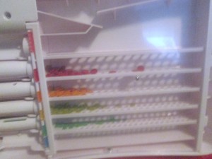 Once the dots fall into the back, you shake from side to side and up and down and the dots will fall through the filters until get are separated. Then you put the pens in place and make sure that the bottom end is slid open (so that the dots can fall in) and tip the Magna Color sideways so that the dots fall in. Occasionally the dots would be tilted sideways and cause the dots to be unable to fill the pen so Ava would bring it to us so we could fix it and then she’d go on her way. Because of these small things, I think for kids under age 8 or so it would be best to have a parent around for occasional help but Ava enjoyed the Magna Color despite these small hangups.