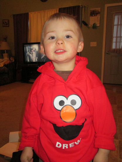 This is a product that is actually made by Personal Creations. I had it customized with my nephews name and seems how he wears 2t and 3t in most t-shirts, I thought I’d order a size bigger so that the hoodie would be a bit roomy on him. I should have known better, becuase I knew that he could still wear a lot of 24month shirts, so of course 4t would be too big. So the hoodie is rather big on him, but this is my fault and not the result of a sizing issue. Though most 3t shirts don’t appear to big on Drew, and this 4t is really big so I would say that even though it’s a hoodie, don’t order a size big to make it roomy – as they are already designed to be that “cozy hoodie” size for the regular size. Drew was really excited to see his pal Elmo on a hoodie. Of course, as a 2 year old he doesn’t recognize his name on the hoodie but for a slightly older child who knows their name, it would be neat. The quality of the design on the front of the hoodie feels much different than the other one did – the other one felt a bit sticky and thick – like it was attached to the sweater instead of part of it. The Elmo on the hoodie feels like it “belongs” on the hoodie and is not sticky at all. I’m really happy with this elmo hoodie and because it’s so big, it’ll last Drew for a few years which is awesome.