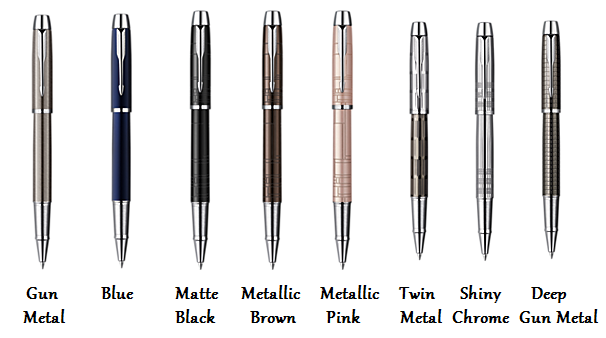 The IM Collection distinguishes itself by its high quality metal finishes and its modern styles. The collection comes in many different colors: Matte Black, Metallic Brown, Chrome Metal, Deep Gun Metal, Blue, and Metallic Pink. There are also 3 writing types to choose from: Fountain Pen, Rollerball, and Ballpoint.