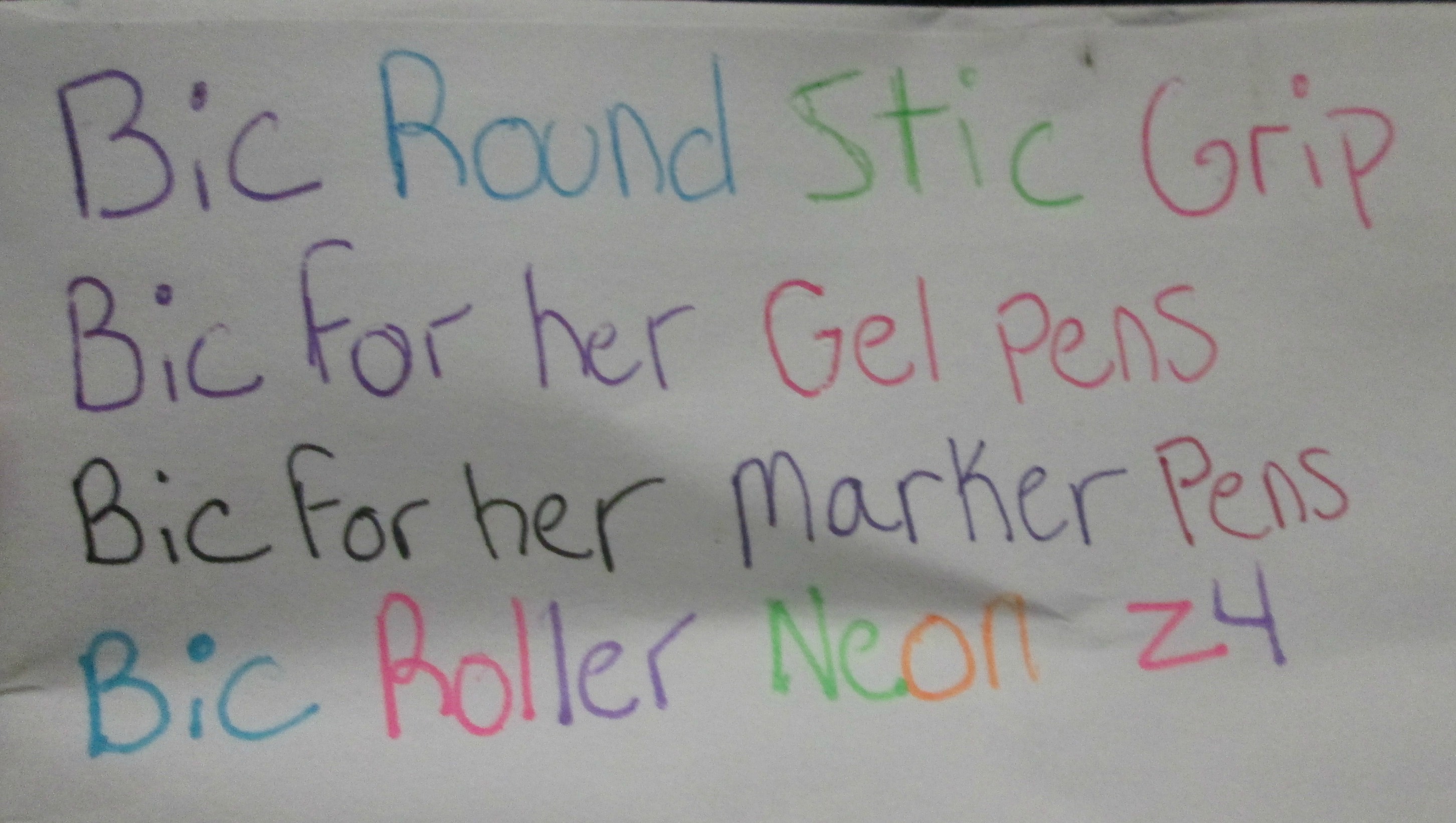 I was also sent a three pack from the Bic For Her line – these ones are called marker pens and the set had a black ink, purple ink and pink in pen included. The shape of the pen is rather straight and the print on the front is squirly and whimsical. The bottom of the pens are colored to match the ink inside so its easy to tell at a glance which one you have. They have a very fine tip but are felt tips like markers on the end so they will bleed if held in place on paper. They have nice, dark print that is darker than the other pens.