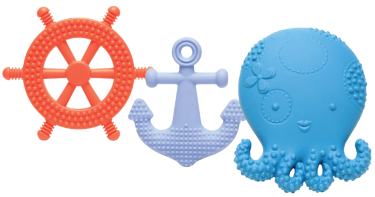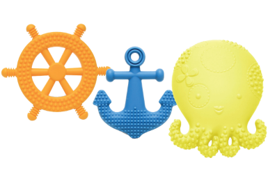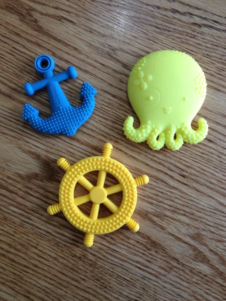 I was sent the Suri the Octopus and Friends 3-piece Silicone Teething Toys in Lemon for review. This set includes Suri the Octopus, The Anchor, and The Wheel. Each character is designed to include multiple texture and sensory points that are made to reach both front and back pressure points/teeth in baby’s mouth. Mayapple Baby Teethers are geared for ages 3 months and up.