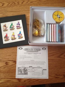 Now I want to share with you our thoughts on the Pirate Talk Board Game we received for review. The game includes a large (18″ by 18″) Sturdy Game Board, 150 Color Coded Cards, 6 Player Pirates, 100 Gold Coins, and the Electronic Spinner. The spinner takes 1.5 volt button cell batteries but they are included. I like the fact that you can turn the volume off on the spinner although the kids prefer it on.