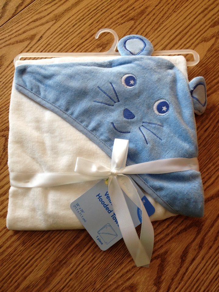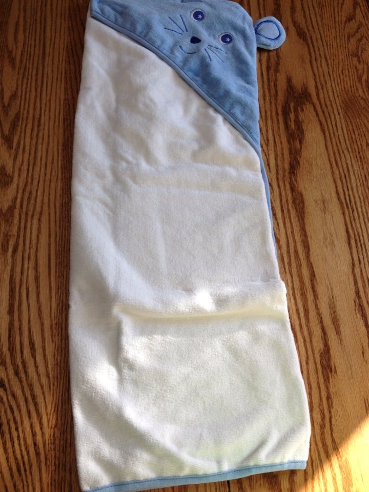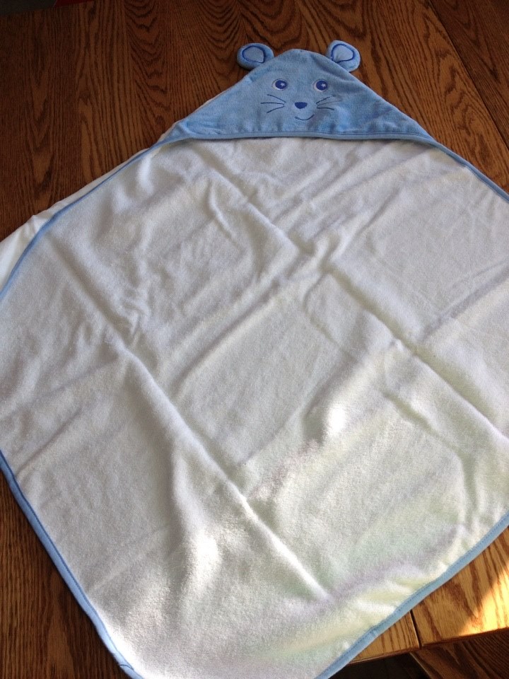 The Velour Hooded Towel is made from cotton and available in three different colors/animals. There is the blue mouse, which I received, the green owl, and the pink bunny. The towel is soft to the touch, which is one of the most important things I’m looking for in a towel. I also like that it’s a hooded towel. When our children are babies, I just feel that the hooded towels keep them warmer as they dry off. I actually prefer to lay down a regular bath towel and top it with a hooded baby towel so they are double wrapped and have their heads covered too.