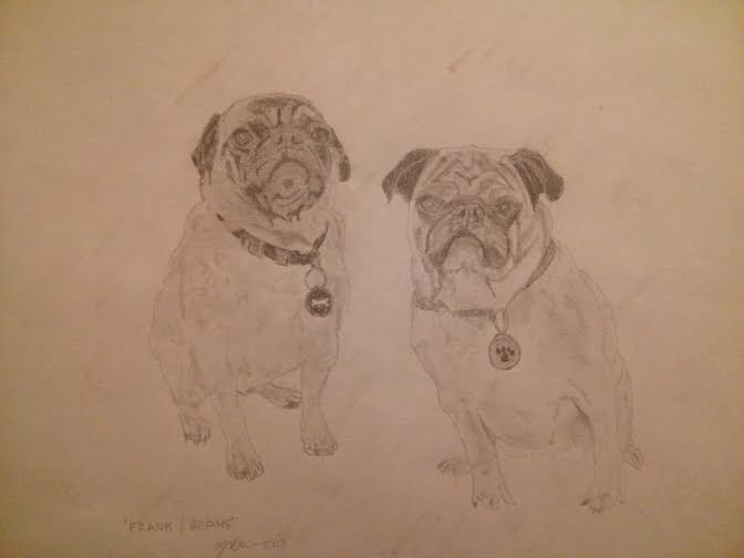 I sent Mitch a picture of Frank & Beans, my pugs, and he combined them into a drawing. The yellowish shade seen here is from the scanner, the paper is white or just slightly off-white, it’s not nearly as dark as it appears. It’s super similar to my photos and does a great job of depicting what they truly look like. The piece is 11 inches by 14 inches which is a nice large size that looks great against the wall. I really like the drawing and can’t wait to go get a frame so I can hang it up.