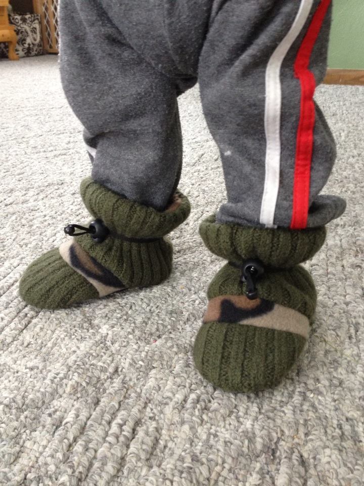 I received the camouflage pair for our 18 month old. I was surprised at how easily they went on but truly did stay on. He even napped in them and they were both still on when he awoke. The slippers slide easily on and then I just pull the “clip” on the string to a snug fit. Easy. I also like that the bottoms have a slightly more durable piece but are still flexible and comfortable.