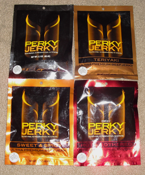 I received Perky Jerky in beef in Original, Sweet & Spicy, Teriyaki, and Hot & Bothered, and well as Perky Jerky Turkey in the same flavors.
