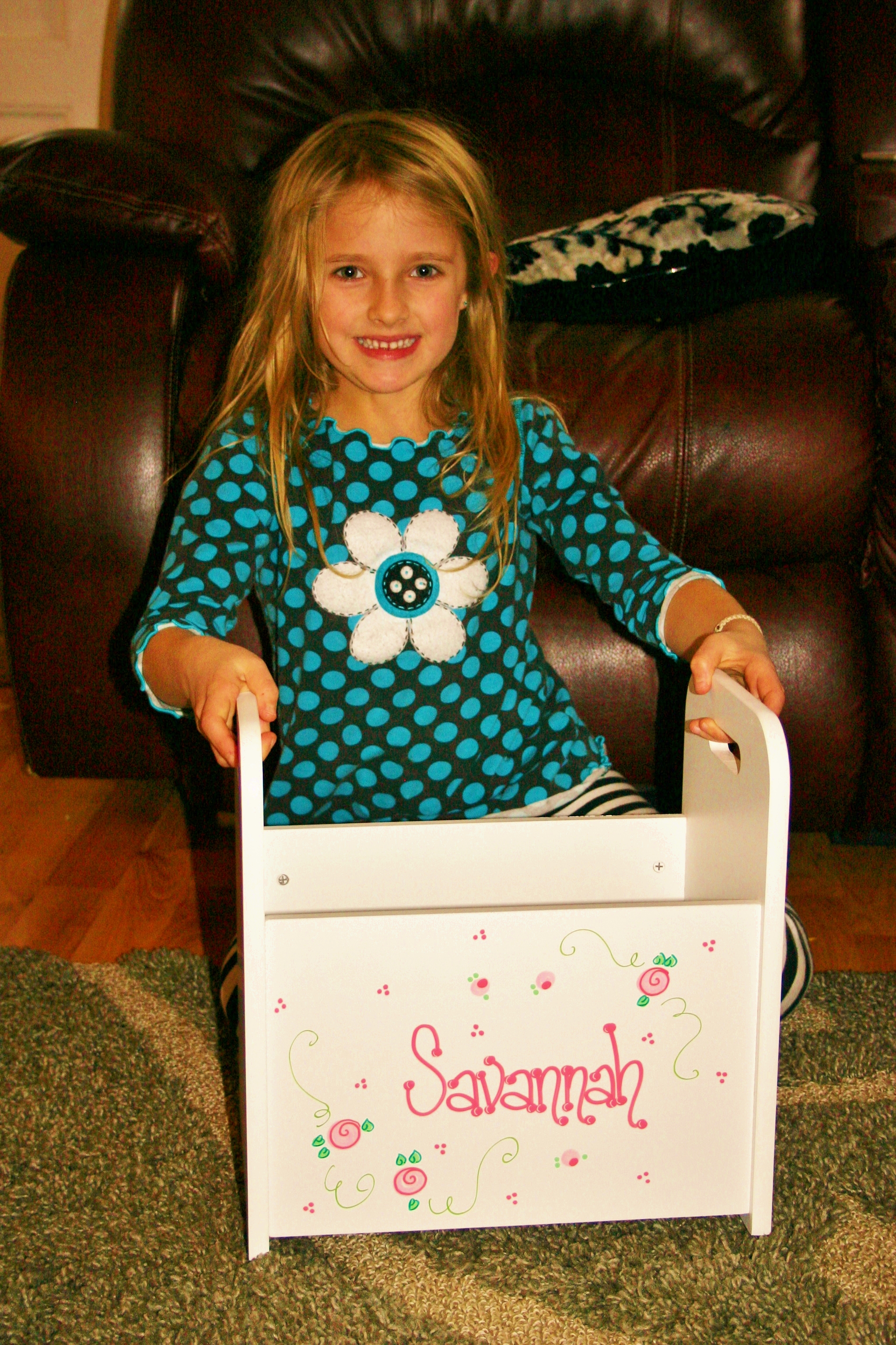 For our review, we received two Personalized Book Caddies. Savannah chose the Rosie Posie print and Cheyenne the Ladybugs & Daisies.