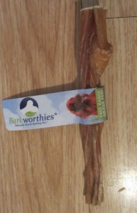 The chew was a Barkworthies bully stick. My dogs absolutely love bully sticks and Barkworthies are one of their favorite brands (not all bully sticks are the same according to my dogs). We got one of these back in our December and January boxes as well. Though we got an apology letter in our January box saying we were suppose to get something else. I don’t mind getting these because my dogs love them but I can see why some people might prefer to have new things each month instead. These retail for about $2.50-$3 a piece.