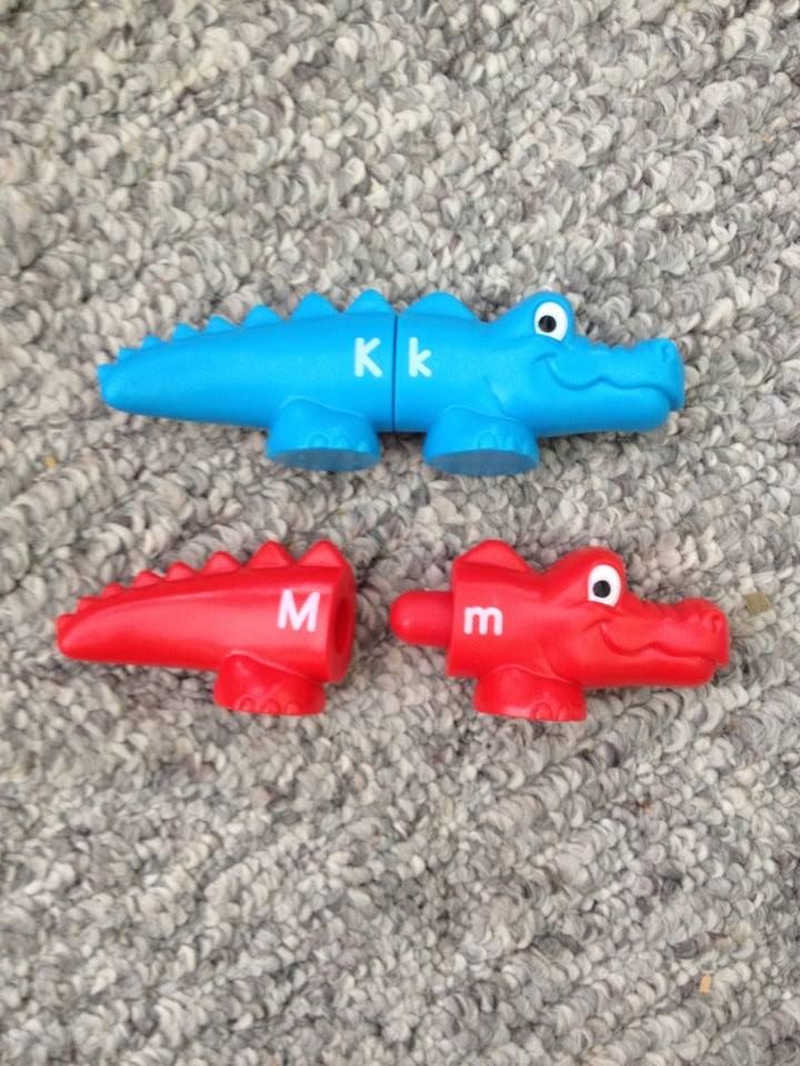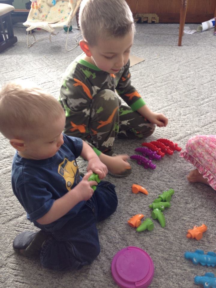 We have found this to be an open ended toy that I can adapt for each skill level of our children. While our youngest at 21 months just hooks up any alligators, our 3 year old is able to match letters with some minimal assistance. For our older two children who are 6 1/2 and almost 9, since matching lower case to upper case would be too simple, I’ll say a word and they will each find the match to the first (or last) sound from the word and then compare with each other to make the match.
