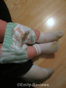 They slip on over their feet and legs, with stretchy sides that don’t require any adjustments. So, there is no need to lay down! When our Little Movers arrived, Kelsie wasn’t quite walking yet but we had no trouble using the Slip-Ons diapers. I pulled Kelsie onto my lap, and helped her feed her feet into the leg holes in the diaper. Then I stand her up and pull the diaper up and she’s ready to go. The process is a lot faster than using diapers with adjustable sides and Kelsie doesn’t fuss because she doesn’t need to lay down.