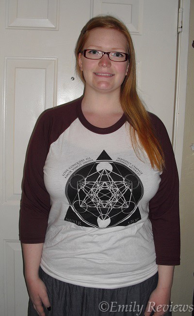 Both of these shirts are Unisex, so they fit men or women. The Do What You Love Raglan is in XL, and the Sacred Geo Raglan is in L. While I normally wear an XL in women’s, I actually think I liked the fit of the L better, so if you’re a woman I’d suggest getting a size down from normal.