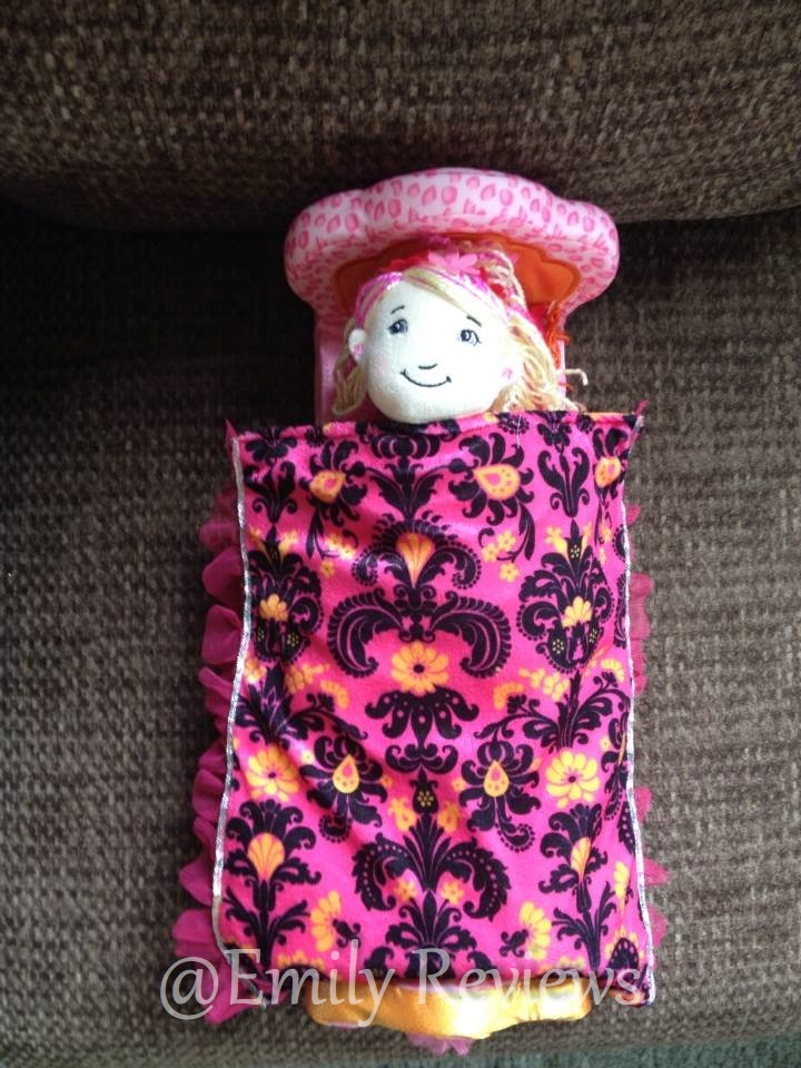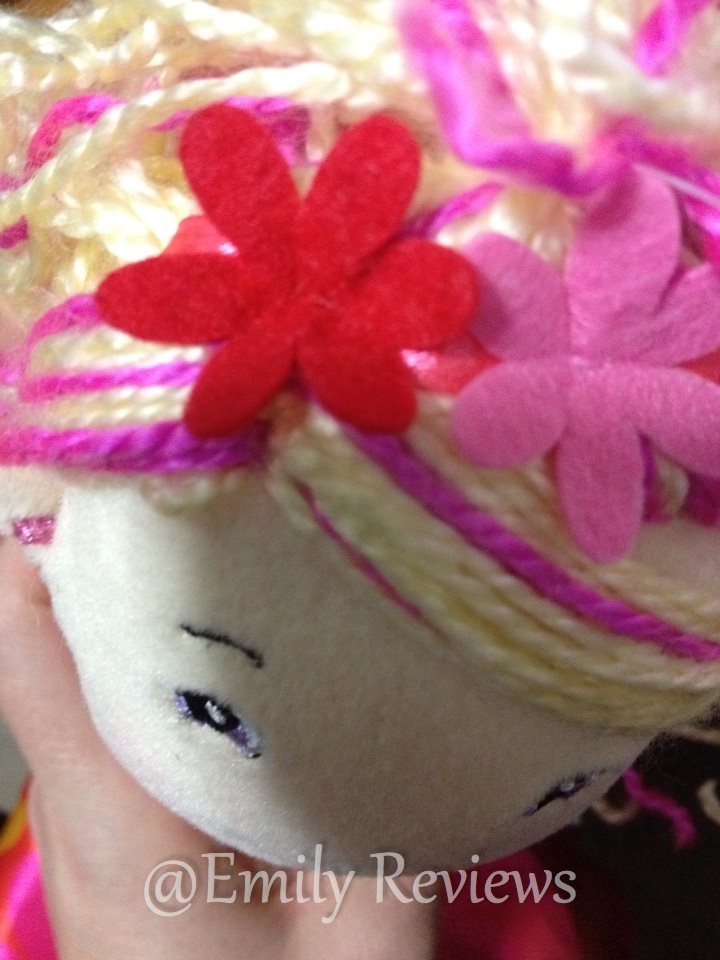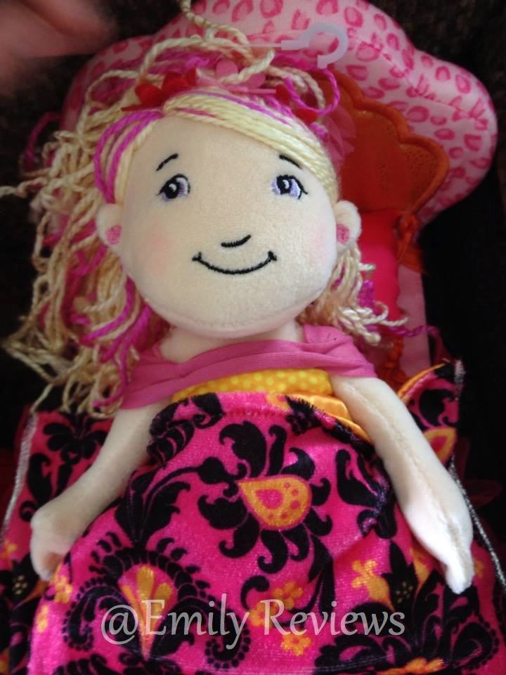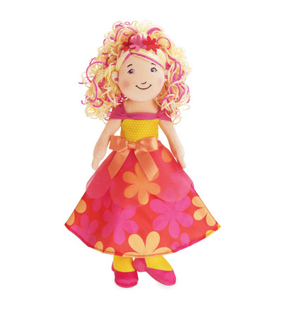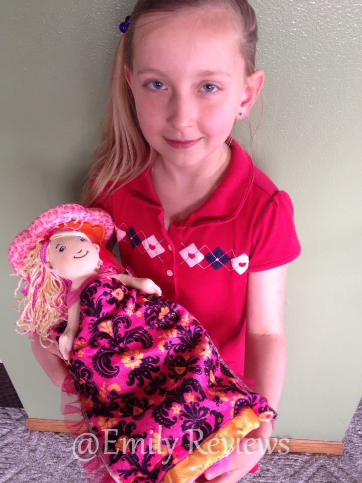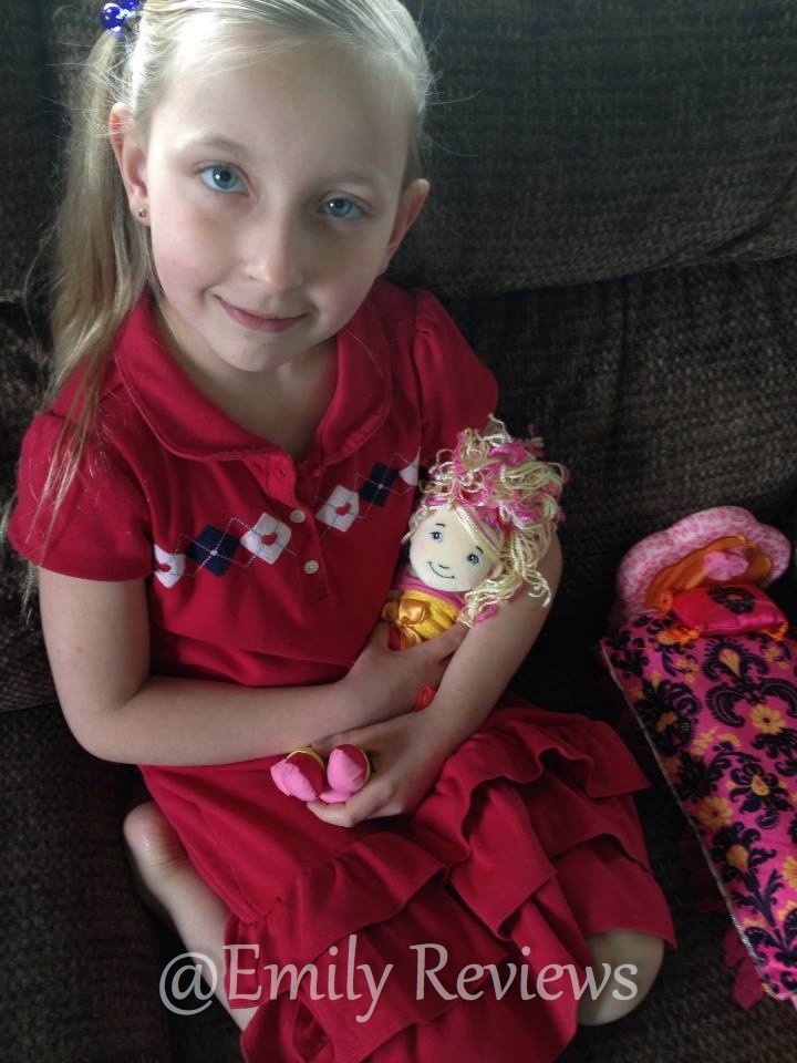 The Groovy Girls Doll line is celebrating its 16th Birthday this year and has a variety of different dolls available in many different colors, styles, and themes. Since our daughter still likes princesses, though, Princess Dahlia was a surefire hit. The little details that Manhattan Toy Company included on Princess Dahlia give her a finished look and make her extra appealing. She has three felt flowers in her pink streaked blond hair. The hair is soft to the touch, slightly curly, and oh so cute. Her ears contain pink stitched-on earrings. I also like the fact that she is wearing shoes but they are actually part of her feet so they can’t get lost.