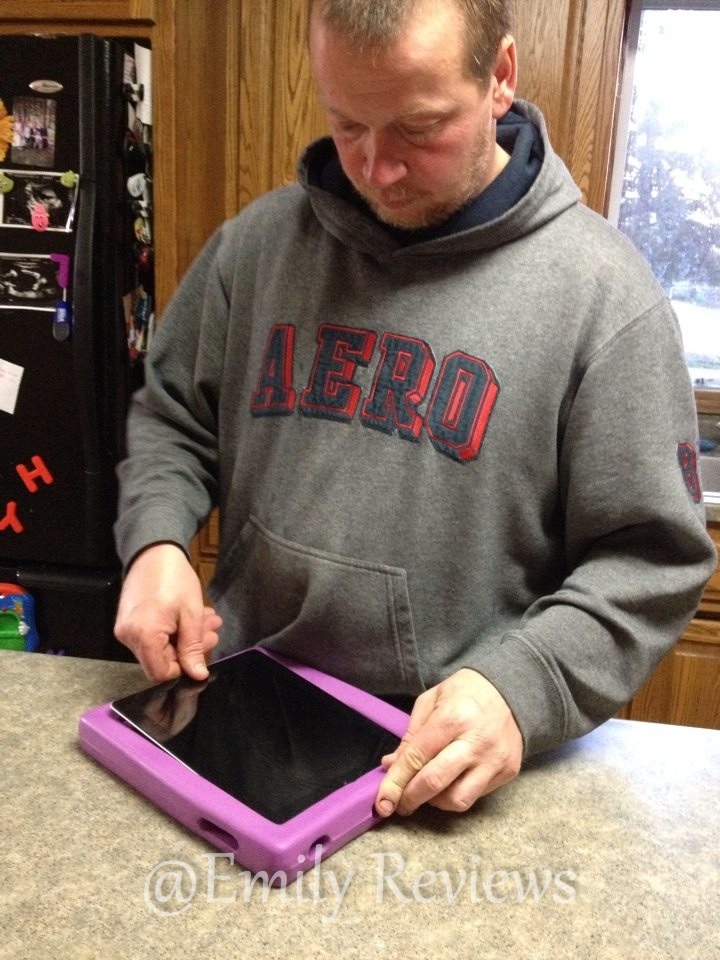 I received the Purple Big Grips Frame and Stand for our iPad 3. My initial reaction was positive and I couldn’t believe how lightweight the Big Grips Frame was. It’s definitely chunky and big but also soft and easy to grab, carry, and hold. My husband had no trouble slipping our iPad into the Big Grips frame, yet it is secure and will definitely not fall out.