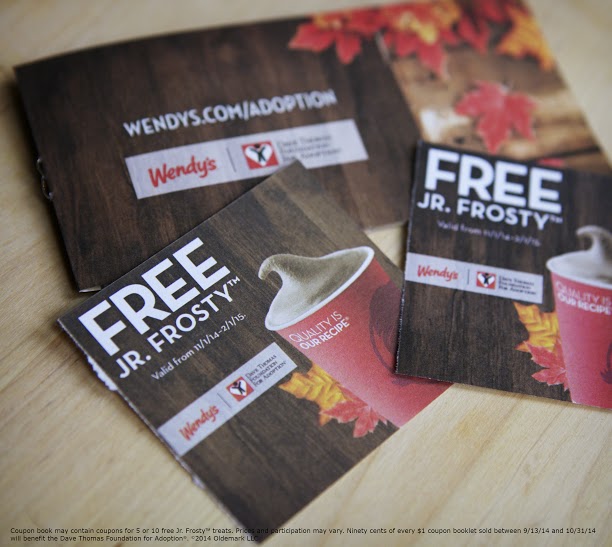 *Coupon book may contain coupons for 5 or 10 free Jr. Frosty™ treats. Prices and participation may vary. Ninety cents to every $1 coupon booklet sold between 9/15/14 and 10/31/14 will benefit the Dave Thomas Foundation for Adoption®. Coupons valid from 11/1/14 through 2/1/15. ©2014 Oldemark LLC