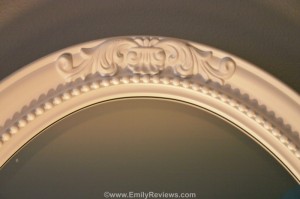 I thought the White Cottage Beveled Mirror would be the final piece to my guest bathroom makeover, but it was too grand for the small space. Instead it earned a place of honor in our front room. The White Cottage Beveled Mirror is 19×27 inch in size. The beveled mirror is surrounded by a beautiful cottage white Victorian style frame.