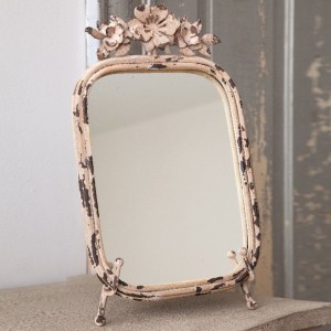 Mirror mirror on the wall, who is the fairest one of all? She will be the fairest one of all with her Rustic Standing Vanity Mirror from Antique Farm House. The charming Rustic Standing Vanity Mirror is 8” x 13.5” H in size. It is made of metal with an aged ivory finish. The top of the mirror is adorned with three romantic flowers. The Rustic Standing Vanity Mirror is perfect for her dresser or vanity top.