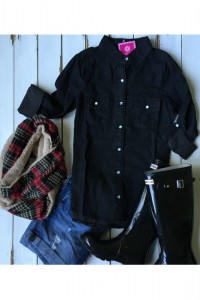 The Long-sleeve black button up shirt is wardrobe staple. This top is great for all seasons. The white iridescent buttons are beautiful. Roll the sleeves up or down to customize your look. The Long-sleeve black button up shirt is currently available at The Style Boutique.