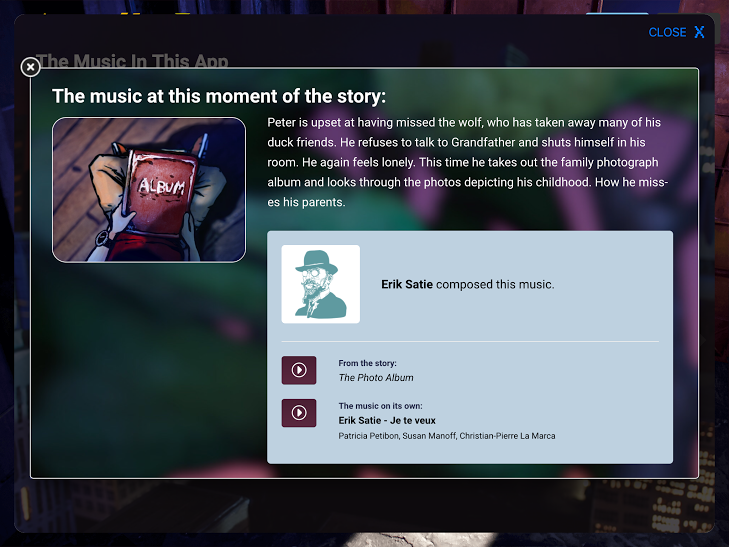There is a lot of nice music throughout the book as well. The app has a section that lets you pick out the different musical pieces from the app to listen to them separately. That area also gives you detailed information about who created each musical piece.
