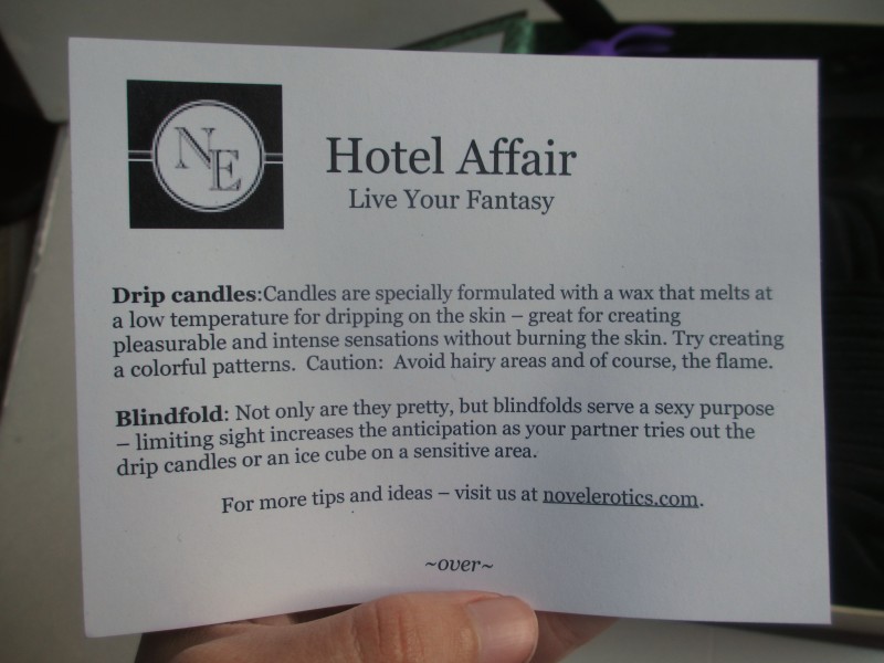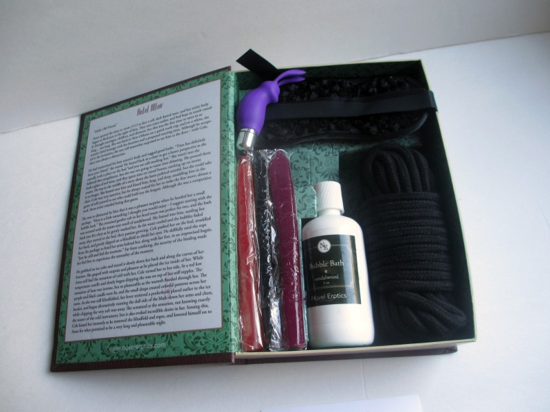 They have a few different “books” to choose from. I was sent the new release, Hotel Affair as a sample to show to you guys. The theme of this box is a Hotel Affair, and each item in the box could be used for a hotel date of sorts. There is a short erotic story on the inside of the box, that discusses two former friends who are both now divorced meeting up in a hotel room. While I imagine that most people ordering this box would have an established spouse or significant other, you can still use the story line to get an idea of how to use the items in the box for a romantic evening. This is a neat way to get inspiration in case you’re looking to role-play, or just want ideas for how to use some of the items inside your Novel Erotics box.