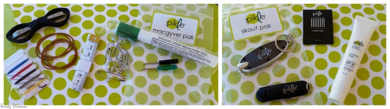 Two other kits you may add to your purchase are the MacGyver Pak and/or Skout Pak. The MacGyver Pak has a spot remover pen, retractable mini scissors, travel size sewing kit, 24″ tailor tape, safety pins, phillips mini screwdriver, straight mini screwdriver, paper clips, and rubber bands. The Skout Pak comes with a pocket knife, flashlight, matchbook and sunscreen SPF 30. I chose both of these kits to keep in my husband’s truck.