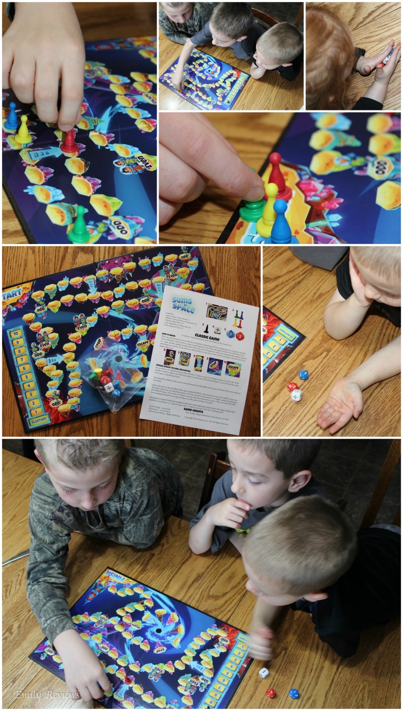 The Sums In Space Math Board Game caught the kids’ attention first because the box cover is quite intriguing, so that was the game we started with. This adventurous math game offers two modes of play: Co-operative or Competitive. My kids wanted to play competitively so we followed those rules. On each turn, the player shakes the three included dice. Two dice have numbers while the last die features + and – signs. Players take the largest number and then add or subtract, based on the roll, to figure out how many spaces they move. Throughout the board are special spaces that also have the kids working on learning odd numbers and even numbers. To make it even more fun, there’s a Black Hole towards the end of the game where players have to roll a large number to skip over, or have to slowly move one space at a time to get through. Whichever astronaut (player) makes it to the rocket ship first, wins!