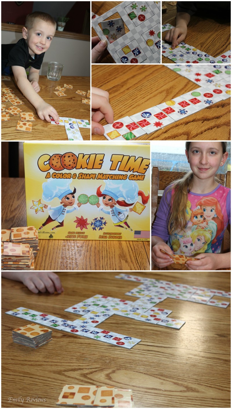 Next up, we played the Cookie Time Shape & Color Family Game. While my kids thought this wouldn’t be that great, they were extremely surprised and pleased with what’s inside. Simply put, it’s a card game that features three different kinds of cookies: squares, circles, and special shapes (variety of stars). Players each start with three cards and take turns building, domino style to create a game board. Points are scored from matching shapes and bonus points are earned by also matching colors and completing a circle. While it seems simple, there is strategy and skill involved as you work on maximizing your points but also playing defense.