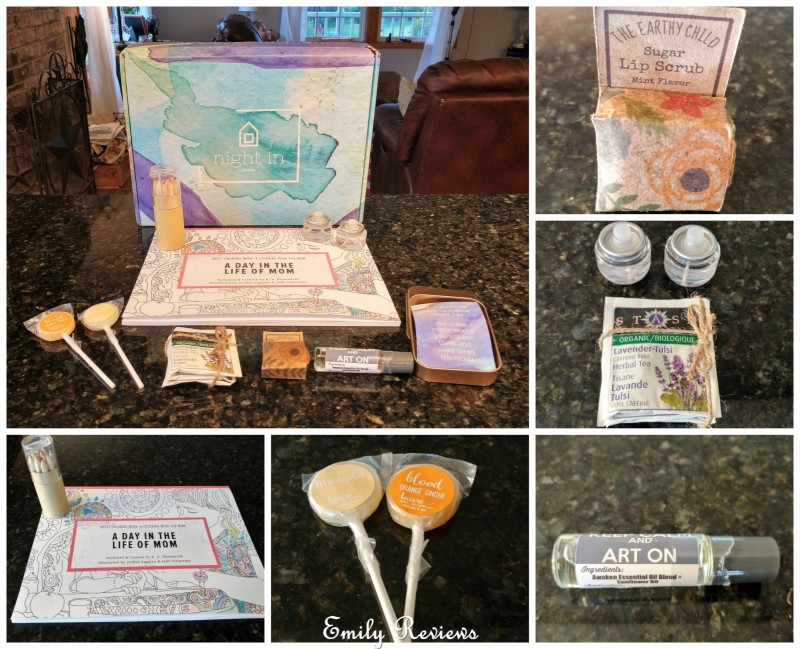 Last month, I received my Moms Night In box. This months theme was “Keep Calm and Art On!”This box came with a Day In The Life Of Mom coloring book, colored pencils with a pencil sharpener, two tea light candles, two lollipops (I am enjoying the lemon one while I write this), an essential oil blend roll on, tea, lip scrub, and a deck of motivational cards.