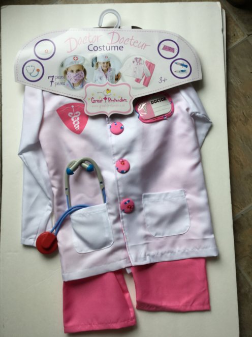 All of my nieces and nephews have gone through at least a short phase of being interested in pretend play. Many have been interested in pretend play for years! My 4-year-old niece has loved dressing up, pretending to cook food, being “mommy” to her baby dolls, and other forms of pretend play for a couple of years now. I was browsing the Great Pretenders site looking for a pretend play outfit for her and once I came across the Pink Doctor With Accessories set I knew it was perfect for her. Her mom works in an elderly care facility and swears scrubs to work each day. I thought she would love having a little set of scrub pants for herself, and then the doctor’s coat, hat and accessories to allow for role play as a doctor. Accessories include a mask, stethoscope, syringe, and thermometer. This set is also available in a green doctor set if you prefer that color.