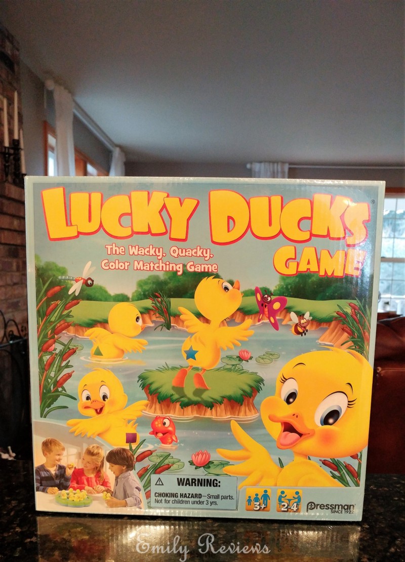 The first game that caught my attention was the Lucky Ducks Game which is geared toward two to four players that are 3 years of age or older. I had a 5-year old help me set it up and she was having great fun, putting the eyes on the ducks and the stickered designs on the bottom of each duck. The object of the game is to be the first to collect the three ducks that match the shape you have selected (there are four shapes).