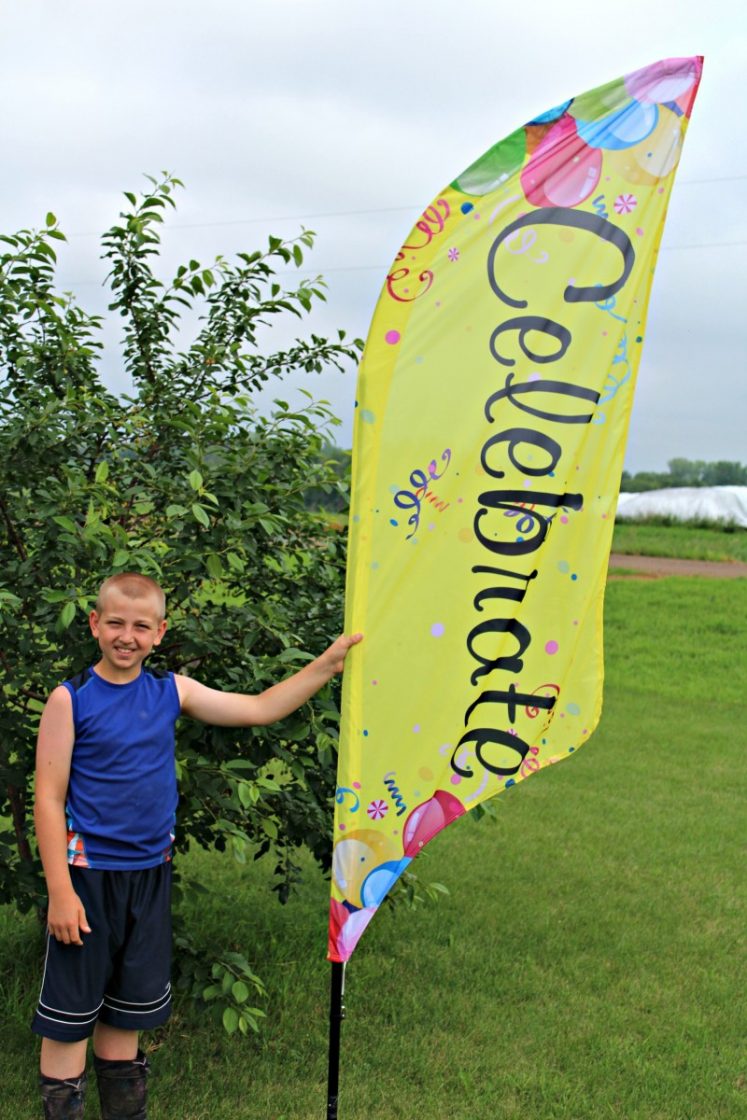 I choose their Deluxe Feather Flag with a Celebrate verbiage and party design. While there are many different color backgrounds, fonts, and options, I was really grateful for a professional’s input. So having a personal designer is a priceless option that I was so happy with! And, I ended up with a much more amazing end product than what I had even imagined!