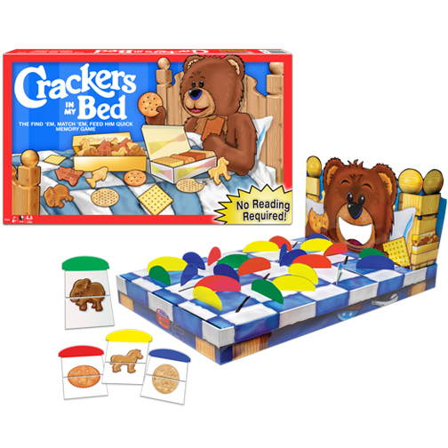 Crackers In My Bed is a delicious matching game. Players need to find crackers hidden in bears bed, make a cracker match (top and bottom,) and feed bear the cracker matches. The spinner (included) determines which color of cracker you select from bear’s bed. The first player to feed bear all of their crackers, wins! Crackers In My Bed is for two-four players, ages four and up.