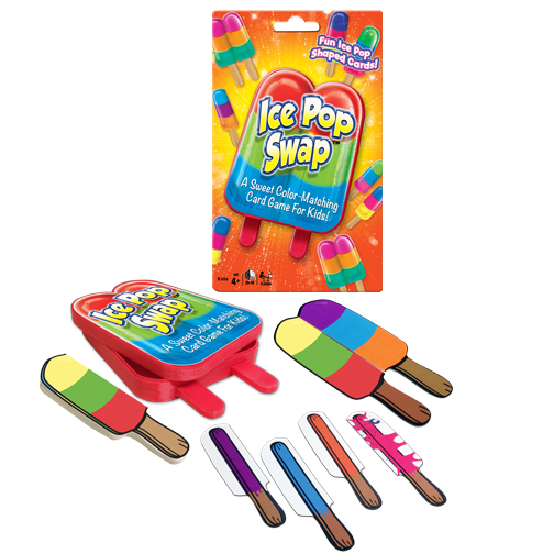 Ice Pop Swap is a sweet swapping game. Players race to see who can collect four ice pop sticks of one color. While playing, be aware of the icky sticks! Icky sticks can make a mess of your winning hand. Ice Pop Swap is for two-four players, ages four and up.