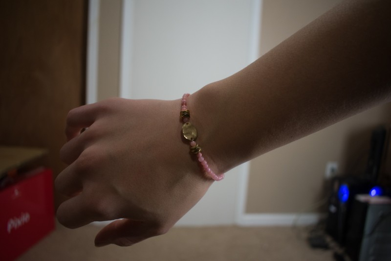 This bracelet is simple but cute. Pink beads with gold-toned accents. I gave it to my niece. I thought it was cute but i’m not very good at remembering to wear costume jewelry or pieces that are color-based and need to be matched to outfits so I tend to only keep jewelry that can go with most any outfit.  It is $10.99 to keep.