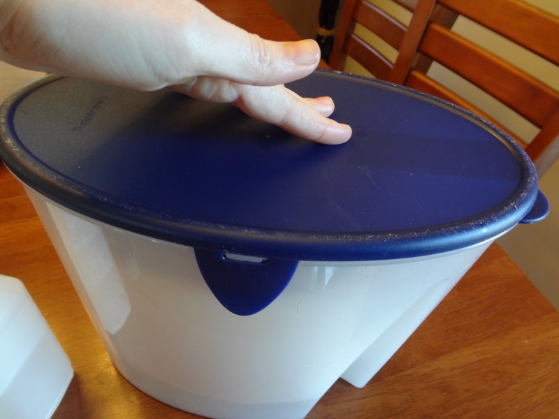 Remove the large lid of your wipe container, ( for me that’s the bottom ) and put your cut in half roll inside the container.