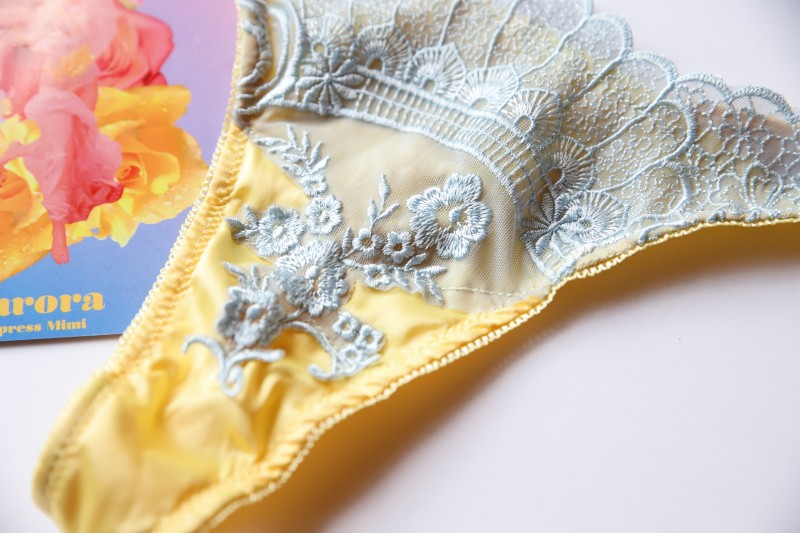 The Aurora G-String is made with attention to the smallest of details with scalloped lace and floral applique on its center that gives a luxuriously romantic touch. Just like the camisole, this g-string is a cheery yellow and has adjustable straps to adjust for weight fluctuations throughout the month. Both discreet and comfortable, this piece will lay flat against the skin and is virtually undetectable under fitted clothes.