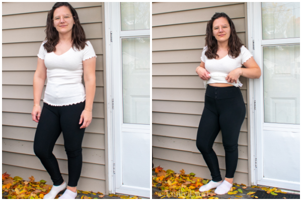 The bottoms here are elastic waist, no buttons, but they have real pockets and look like real jeans at a glance. I love the “jeggings” like this that Nadine West often sends. They’re a keeper for me. These are $37.99.