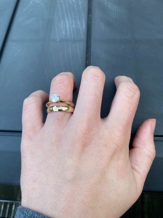 I don’t entirely know why, but I have just always loved classic plain gold wedding rings that coordinate. I knew I wanted my husbands to be thicker and mine to be thinner, but them to otherwise match.