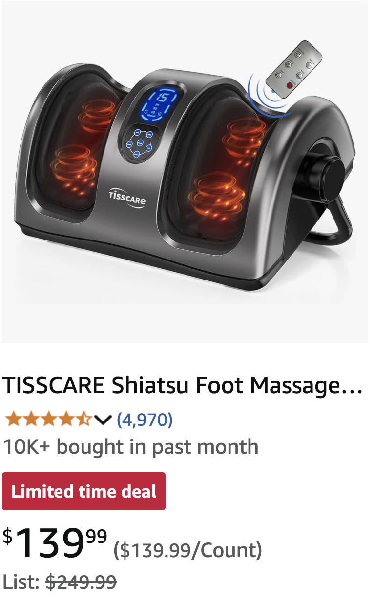 Pamper yourself with ease! This foot massager features 4 simulated hands, 10 rollers, and 96 nodes that replicate professional massage techniques, including kneading, scraping, rolling, and Shiatsu. With 3 intensity levels and adjustable timer settings (5-30 minutes), it caters to all your relaxation needs for a truly authentic experience. Buy it on Amazon.