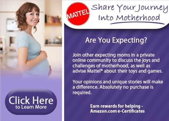 Mattel is looking for expecting moms to participate in an online community. Each month there will be questions and discussions regarding motherhood's joys and challenges. Sometimes you'll also be asked questions about Fisher Price toys and games. You'll get $5 for joining and $10 for each month you participate. Click this link to apply to see if you qualify. http://bit.ly/1X3U3OM